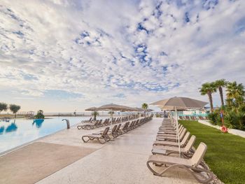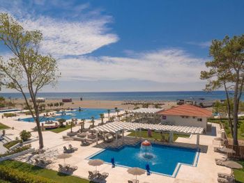 Отель по качеству сопоставим с турецкими отелями Все включено. - Отличные бассейны и песчаный пляж - Разнообразная и вкусная еда (хороший выбор мяса, морепродукты (рыба, креветки, осьминоги, кальмары), разные сыры, хамон и пр.).Вкусные сладости Качественный алкоголь (вино Тыквиш безлимитно, пиво разное).Маленьким детям детское питание в баночках. - Вежливый и отзывчивый персонал. - Хороший интернет. было достаточно для просмотра ютьюба на ТВ и созвонов в Zoom по работе.