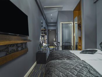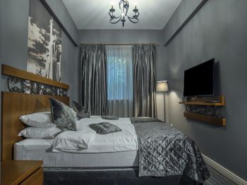 Номер маленький по размеру, идёшь мимо кровати и постоянно стукаешься о полку под телевизером. Минус второй за то, что находится номер в полуподвале и окна смотрят в землю(.