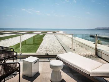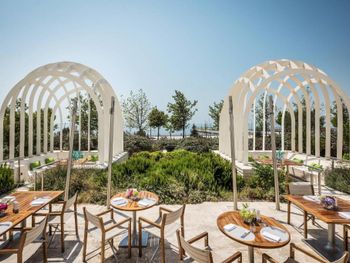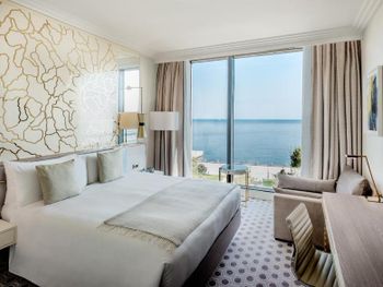 Кофе делается в антисанитарной зоне. Подается по 15 минут капучино и латте. Грязные номера с плесенью в ванной. 1 зубная щетка на семью. Прожженный пол, фантики от шоколадок. Вид на море, только прямо, по бокам 100 метров в длину у Вас будет вид на отель. Пол в коридорах на этажах отвратительно грязный. Если Вы с коляской, дверь входная открывается ужасно плохо и тяжело. За то в отеле охраны много, очень полезная функция.