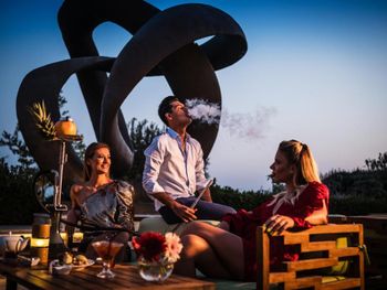 Сам отель находится на отшибе с видом за какой-то нефтяной завод или что это было с факелом из трубы. Когда сидишь на террасе с видом на море, то на тебя периодически сносит запах солярки.