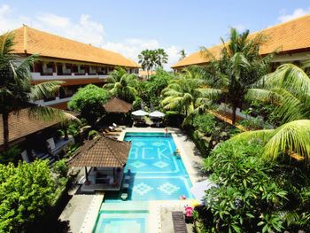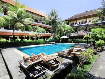 Территория отеля выглядит как оазис среди городских улиц, много зелени, балкон номера на 1-м этаже в окружении растительности, столик и стулья на нем. Возможность загорать и купаться в бассейне, где кстати народу всегда было мало. В номере было все в порядке, и мебель, и сантехника, имелись холодильник и электрочайник, телевизор. Завтраки довольно сытные, соки и фрукты, всегда еще можно заказать омлет или яичницу, и при этом никаких очередей, как бывало в других отелях. Напротив отеля есть магазин, где можно приобрести продукты, напитки, в том числе и пиво. В двух шагах от отеля направо находится varung (кафе для местных), где очень дешево можно перекусить, блюда выставлены, указываешь, что тебе нужно, работник вручает тебе карточку с суммой оплаты, очень удобно. Стоимость обеда примерно 300-330 рублей на двоих, если с пивом, то 600-630, пиво здесь очень дорогое, и для меня это большой минус отдыха на Бали. Про персонал: отзывчивый, на любое обращение реагируют довольно быстро, оказывают помощь в вызове такси в аэропорт. От отеля до пляжа 800 метров, мы уходили влево, где мало народу, волны не то что очень большие, купаться можно, но осторожно, часто встречаются течения, уносящие в сторону моря. Мы в этом отеле проживали 10 дней, ездили на 2 экскурсии с русскоязычными гидами, которые забронировали на Трипстере. Читал отрицательные отзывы об отеле, что такой уставший, некомфортный, только ночь, другую переночевать, по моему это неправда, да и все таки это 3 звезды, а не 4 и 5. Хорошее место для полноценного отдыха, и мы довольны, что выбрали именно этот отель. И еще вишенка на торте. Мы прибыли в отель рано, на ресепшене сказали, что заселение с 2 часов дня, мы сходили, обменяли доллары на рупии, вернулись в отель, оплатили проживание 4500000 рупий, в рублях 22140 (2200 рублей, за ночь, что довольно дешево) и еще положили на стойку шоколадку Аленка, после чего тут же и ключ от номера был выдан. Пожелаю всем позитивного настроя и тогда будет вам счастье в этом отеле.