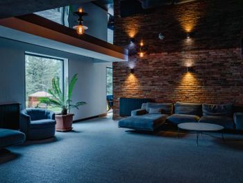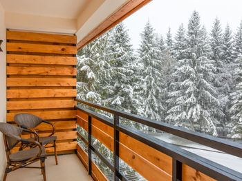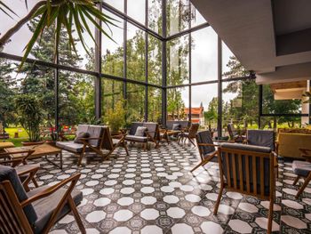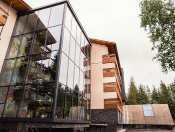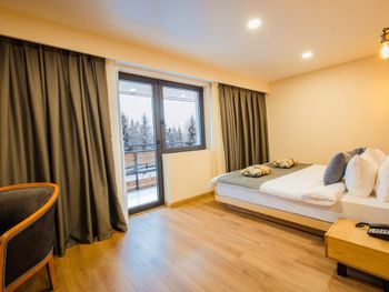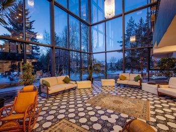 Панорамные окна, красивые ели на территории и вид на горы из номера. Чисто. Вежливый персонал в зоне СПА и хороший массаж, на этом все