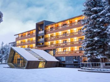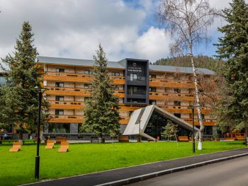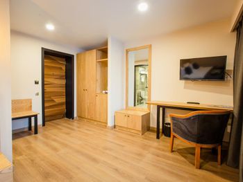 Отличное расположение, тихое живописное место. Очень теплый и уютный отель. Номера верхних этажей имеют красивый вид на долину и горы. Ухоженная зеленая территория, ощущение соснового леса.