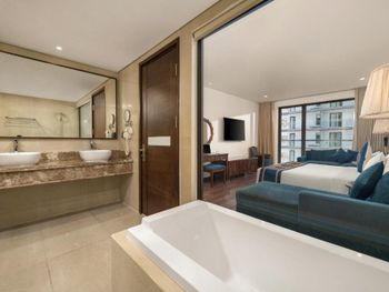 На балконе не хватает стульев. А так можно и небольшой столик, посидеть на свежем воздухе, выпить чего-нибудь вкусного и наслаждаться видом. Не очень удобный санузел. Не дают второй ключ от номера. Не очень удобно расположены розетки в номере. Слабоватый холодильник (минибар). Бассейн, при всём своём панорамном виде, скучный. Если бы не бар там же, делать там было бы нечего. 4 лежака занятые спящими туристами. Панорамное стекло грязное. Пляж в данной локации максимально заполнен туристами весь день.