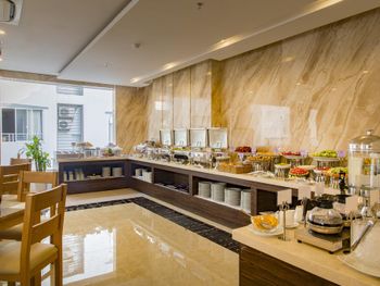 На стенах были пятна от черного грибка. Неприятно. За проживание ребенка 7 лет в номере без предоставления дополнительного места взяли 150000 донгов за сутки. Сказали за завтрак, полотенца, гель (который подкладывали один тюбик на день, на всех). Ребенок на завтраке съедал по два блинчика не более. Вообщем не поняла за что заплатила. Вокруг отеля - грязь, стройка. Тыкают дом на дом. Каменные джунгли.