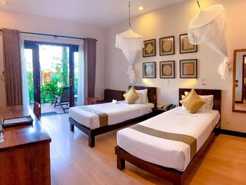 Территория у отеля очень ухоженная, красивая, тихая, как будто живешь в джунглях. Мы жили в маленьком домике на 2м этаже, в номере был большой балкон. В номерах также чисто, нет насекомых, что очень нетипично для Азии и это огромный плюс. Завтрак довольно разнообразный, можно найти варианты еды для детей, которым не привычна азиатская еда. При отеле работает ресторан, в котором вкусно готовят, можно разок остаться на ужин. Отель помог организорвать трансфер, из аэропорта нас забрала очень комфортная машина.