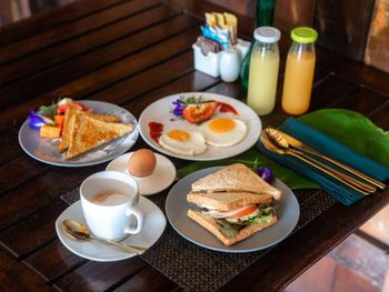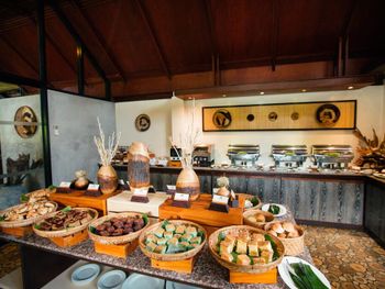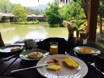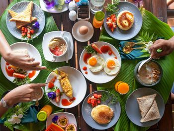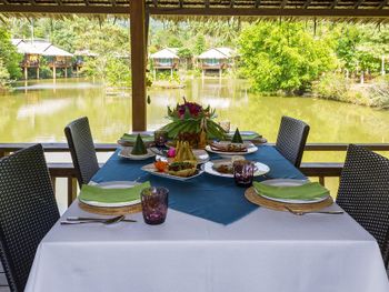 Завтраки прекрасные в домике у озера. Частично шведский стол, часть готовят по меню. Обеды и ужины можно заказать в номер, а можно поесть у бассейна.