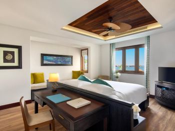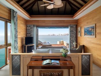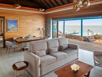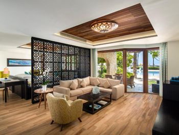 The elegant accommodations are decorated with Arabic design and features a view of the Arabian Sea. Each includes a flat-screen TV, an outdoor seating area and a minibar. The villas feature a large living room and private pool. The bathroom has Anantara signature amenities, a bathtub, and a shower.