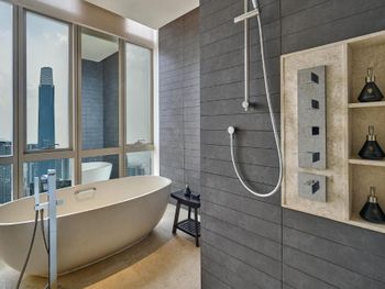 Завтрак шикарный, в номере унитаз с подогревом крышки, и автоматическим биде с теплой водой. теперь хотим себе такой же домой. Ванна с панорамой на красивый город. Все номера расположены на трех этажах 55,56 и 57.