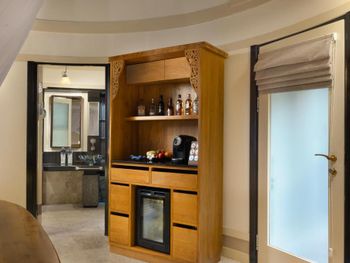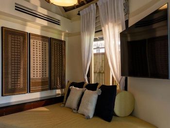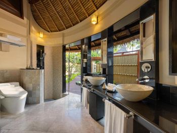 Ооочень старый отель! Устарел морально и физически и уже давно. Мы были уверены в марке Banyan Tree, поэтому то, что увидели здесь, было полной неожиданностью. Во-первых, сама конструкция виллы: трудно представить более бездарно спланированное пространство! Такое впечатление, что виллу поставили задом наперед. На входе расположился крошечный бассейн и санузел. Наша вилла стояла так, что унитаз отлично просматривался из офисного здания напротив. Наверное, нас никто не рассматривал специально, но чувство не из приятных, прямо скажем. Двери там нет. Хоть бы кусты какие-нибудь посадили. Сама вилла в форме раковины, поэтому комната (спальня) круглая и очень тесная (как они насчитали там 110м2?!). В центре - кровать. Куда бы вы ни шли, она оказывается на дороге. Это жесть! Написано, что это номер на троих. Не представляю даже, где там можно разместить еще одного человека. Правда есть кушетка, но она неправильной формы (в месте расширения раковины), не уверена, что там можно обустроить комфортное спальное место. Но самое интересное, что другая, диаметрально противоположная дверь из комнаты ведет к пляжу. Вроде бы чудесно: вышел из домика, нырнул в морскую лазурь... Однако потом нужно бы смыть с себя соль. Вот здесь вас ожидает подстава: душ-то находится в санузле, чтобы попасть в который нужно мокрому и распаренному пройти через всю кондиционированную виллу, обойти долбаную кровать и потом так же вернуться обратно. Кстати, душа там два. Непонятно, почему не вынести один из них на другую сторону виллы, к пляжу. Уборка номера ужасная, хоть и дважды в день. Фактически это просто замена полотенец и застилание постели.