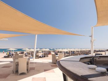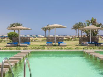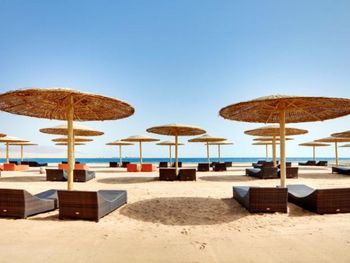 Считаю, что на пляже было бы всем комфортно, если бы персонал следил за тем, чтобы под одним зонтом располагалось 2 лежака и хотя бы 1 загородка от ветра. Иначе народ стаскивает себе нужное и ненужное количество лежаков и загородок. В результате часть людей не может найти себе комфортного места. Это при том, что ценовая категория отеля достаточно высокая. Не помешали бы арабские блюда в питании.