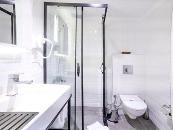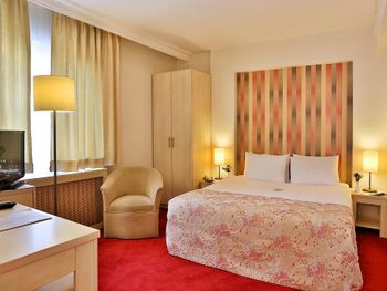 Фотографии на Booking не соответствуют действительности... Вроде бы номер тот же, но по факту - он в реальности меньше, комната с кроватью - просто крошечная; всё достаточно уставшее, гостиница откровенно не соответствует стоимости (по моему мнению, естественно). 65 евро - это слишком; про 130 (если без скидки на букинг) я вообще молчу - бред полный... Всё требует срочного ремонта, это не уровень нормального комфорта - это совершенно точно.