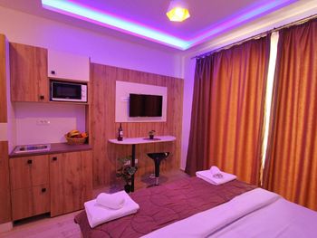 Чистый номер, в номере миникухня (посуда, микроволновка, холодильник, индукционная плита), удобные матрасы и подушки. Ежедневная уборка номера с заменой полотенца. Есть лифт. Рядом фастфуд, очень вкусная курица гриль 8 евро.
