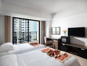 Неплохой отель за свои деньги. Немного уставший, но нас с сыном это не сильно смущало. Отличное расположение - пять минут до пляжа, рядом кафе, магазины, недалеко (рядом с отелем Гавайи) остановка городских автобусов. Такси постоянно курсирую или стоят на улице, мы легко поймали в 2 часа ночи, когда ехали в аэропорт. В номере есть халаты, резиновые тапочки, три вида полотенец в ванной, плюс пляжные. Зубные щётки, гель, шампунь - всё есть и добавляют постоянно. Но нет мыла. Я взяла с собой кусочек, почитав отзывы, очень пригодилось) Так же в номере есть крошечный холодильник (нам заменили по просьбе, т.к. был не рабочий и дали доп.карточку, чтобы не выключалось электричество в номере, когда уходите), чайник, чашки и стаканы, чай чёрный и зелёный добавляют каждый день. Сахара, кофе, ложечек нет. Сейфа нет. Вай-фай в номере был устойчивый, только один раз пришлось перезагрузить кнопкой роутер и восстановить сигнал. Уборка и замена полотенец каждый день. Замена постельного - по просьбе. Белоснежное постельное немного компенсирует потёртость номера)) Мы жили на 25-м этаже, номер с балконом и видом на город. Красивый вид, частично были видны фениксы, дома-деревья, пляж, а ночью всё в огнях иллюминации. Ночью шума особого не заметили, только раз китайцы где-то громко пели в караоке, да соседи двигали мебель и громко разговаривали допоздна. Но в общем не скажу, что шумно. На минус первом этаже есть отличный супермаркет с хорошими ценами. Работает с 9 (или 8:30) до 23 часов. Завтраки в отеле хорошие, сытные. Я бы сказала, обычные азиатские отельные завтраки. Но сосиски-колбаса не вкусные (китайские))) Фрукты были двух видов. Чаще всего арбуз с дыней или цитрусами.