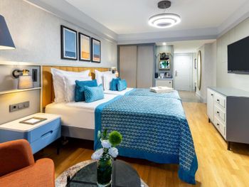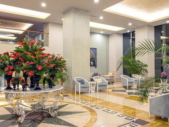 Я бы вернулась в этот отель снова. На входе ждала приветливая Ирина и не менее приветливая Тамара. Говорят на русском. Невероятно добрые и прекрасные девушки. Сам отель очень комфортный, все по делу и без лишней площади. Немного устаревший, но чисто и нет ничего ужасного. Если планируете спать днем, то просите самый дальний номер 1302. Там было тихо и мы прекрасно спали днем (ночью слишно музыку). Питание: есть диетическая еда, веганская, нбезглютеновая, детский стол и пюре для самых маленьких в баночках.