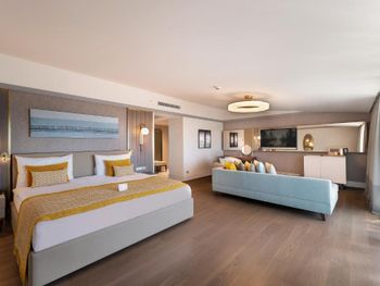 насчет минусов данного отеля, то их не мало. Начнем с питания, к сожалению повторяющаяся изо дня в день одна и та же еда надоедает уже на 3 день! морепродуктов было крайне мало, что очень грустно! для пятерки такого уровня, еда не соответствует! кстати было много сладостей, хотя лучше бы сделали акцент на основной еде, чем на сладком! Далее, сервис в номерах плохой, после уборки номера не обновили напитки в баре, не положили чай, кофе и в душевой закончился шампунь, пришлось звонить на ресепшен аж 5 раз, чтоб наконец принесли чай, кофе и шампунь!!! для отеля такого уровня это недопустимо!!! Заход в море ужасен, плиты, камни, только ноги отбить. Купаться приходилось с пирса, там с пирса спускаются в воду 2 лесиницы и по ним сходишь в воду, так вод поднимался из моря по одной из этих лестниц и порезал палец об саморез торчащий из этой лестницы!! Вообще считаю, что отель такого уровня должен чистить заход в море с пляжа от камней и плит!!!! В другой раз рассмотрел бы другой отель за такие деньги!