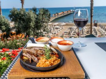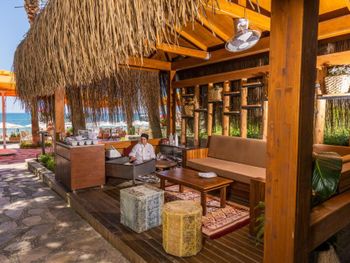 Небольшие минусы - мухи на еде и вход в море с камнями и кораллами + слишком близко к скутерам, от которых бензин плавает (советую плавать левее на пляже у соседнего отеле с синими зонтиками)