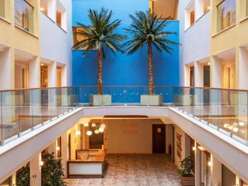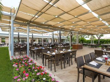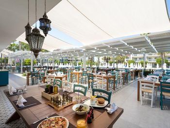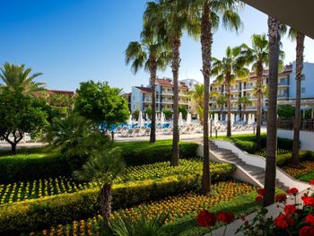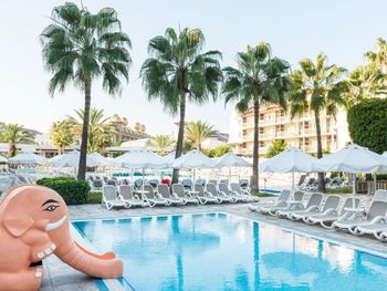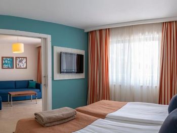 Отличный отель по соотношению цена-качество. До моря ровно 5 минут (от выхода из отеля до входа на пляж), собственный пляж с очень долгим пологим входом, что идеально для детей. Для полотенец дают пляжную сумку. Лежаки стоят на хорошем расстоянии друг от друга, заранее их никто не занимает. Пляж чистый, мусора в песке нет. Номер в отеле достался нам очень большой, на 4м этаже с кучей шкафов и пространства. Очень здорово, что номер двухкомнатный, что очень удобно с ребёнком. Соседей не слышали, шумоизоляция хорошая. В отеле нет шумной анимации - для моей семьи это идеально. В 20.15 в холле мини диско, после - небольшое шоу для взрослых, которое не орёт на всю территорию отеля. Понравилось, что хороший детский стол и есть что выбрать из еды ребенку - были и котлетки (бифштексы), и супы, и пельмени. В целом основная еда вкусная и качественная, большого разнообразия нет, но то что есть,понравилось. Бассейн с горками оказался хоть и маленьким, но классным - они очень быстрые! Легко подниматься и нет очередей. Один раз ходили в крытый бассейн, сауну и хамам- там все отлично. Удобно, что в отеле есть минимаркет с вполне адекватными ценами. Для оплаты в нем не нужны наличные - стоимость покупок записывается по карточке от номера на ваш счёт. Территория отеля небольшая, но красивая - растут оливки, апельсины ипрочие красивые кустарники.