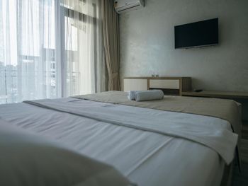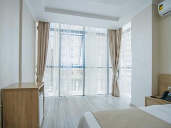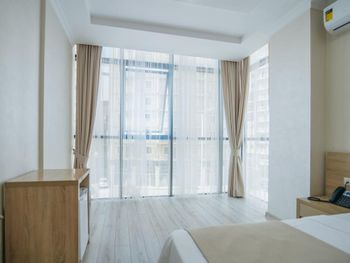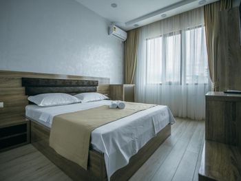 Район грязный, вокруг стройки, дороги разбитые, до пляжа пешком идти долго через стройки и Грязь, рядом магазинов нет, только автомойка под окнами. Спать с открытым окном невозможно, дорога очень шумная. Спать с закрытыми окнами невозможно- в номере присутствует специфический запах, напоминал кошачий корм. На постельном белье увидели тёмный волос, пятна. Ванна без шторки, очень грязная Сантехника, раковина в налёте. Валялся непонятный мелкий мусор. После купания вся ванная комната залита водой, горячая вода на 9 этаж поднимается очень долго. Завтрак- отвратительный. Вареные макароны, вареные яйца, варёная картошка и гречка, сосиски самые дешёвые, масло хуже маргарина, кофе- 3в1 самый простой, чай оставляет делать лучшего. Персонал- совершенно не идёт на контакт. Мы оплатили сразу все 5 ночей, но после 1 ночи поняли что в таком месте жить просто невозможно. На нашу просьбу вернуть хоть часть денег ответили отказом, ссылаясь на то что деньги уже ушли в банк и сам букинг уже взял свой процент. Мы были согласны на любой возврат, хотели связаться с директором или бухгалтером, но девушка на ресепшене нам отказала. Отель совершенно не отрабатывает свои деньги, никаких плюсов у него нет. Картинка красивая в рекламе и все!