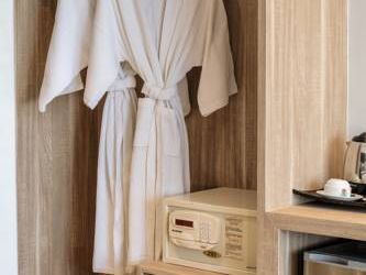 Теперь о минусах. Бассейн чисто условный, мелкий, небольшой, плавают жуки, листья и пр Сушить вещи негде, т к унас был просто улучшенный номер без вида на море, он находится на первом этаже, у номера есть веранда с крышей, а напротив забор, поэтому солнечный свет туда не проникает)) Учтите и берите с видом на море, тогда скорее всего поселят в корпусе с балконами. Дверь. Карточка для входа одна, у двери существует два положения- закрыто и открыто на 90 градусов. Дверь тяжелая с доводчиком. Если вышли на террасу даже на пару минут карточку лучше с собой Если один на террасе, а второй в душе- то или в душе без света, так или на террасе пока из душа не выйдут и не запустят. Или с открытой дверью- но комары))) Не очень удобно.