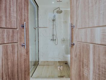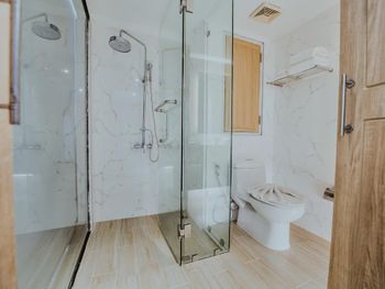 Стеклянная душевая с туалетом. Снаружи висит штора в рулоне. Ее можно растянуть, но всеравно она так работает что остаётся 10см полоса не закрытая. Для тех кто не стесняется находясь в туалете передавать привет тому кто лежит на кровати и смотрит телевизор.