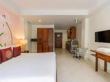 Просторный номер, есть кухня, стол и стулья, постельное белье белоснежное, есть туалетные принадлежности, не далеко от тц терминал 21, тихо, спокойно