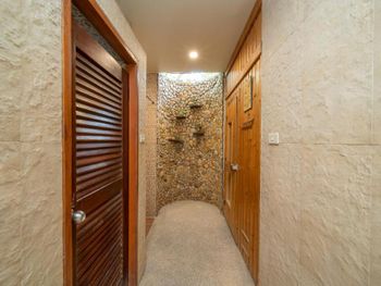 На поверхности воды бассейна было несколько опавших листьев и цветов. Много замков на двери и металлические двери с решёткой на балконе заставляют задуматься о безопасности района. Нет рядом массажных салонов
