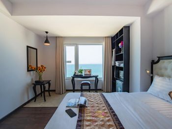 Сначала заселили в плохой номер, но быстро переселили в соседний. 12 этаж вид на море отличный. Пляж рядом через дорогу в 5:30 ещё не рассвело вьетнамцы уже на пляже. Не далеко рынок из отеля на левой затем опять на лево в сторону от моря потом на право по параллельной дороге 1.3- 1.5 км покупали фрукты. На дороге перпендикулярной морю по левой стороне 150 метров кафе, хорошая еда, и местная и для людей. Дальше есть "Буфет" платишь примерно 300 донгов и шведский стол из разных морских гадов, земноводных сырых и готовых с пивом или без, есть улитки,креветки,крокодил,лягушки кому что нравится. В отеле только на рецепшен молодая но мрачная тётя говорит по английски, другие ничего не понимают, улыбаются но жестами можно кое что объяснить. Отель не новый но все работает. Кровати нормальные, иногда была тёплая вода. Номер был как на фото.