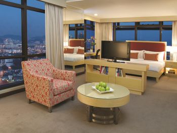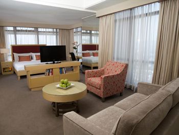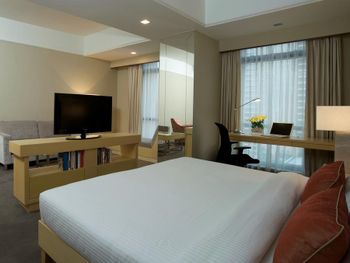 Красивый отель, огромный номер со всеми удобствами, включает кухню с чайником, чаем и кофе, гостиную с телевизором, много шкафов, большую кровать, ванную и душевую с душевыми принадлежностями, просторный санузел. Жили на 27 этаже. Замечательный персонал.