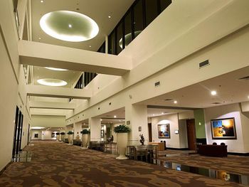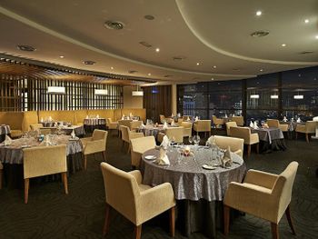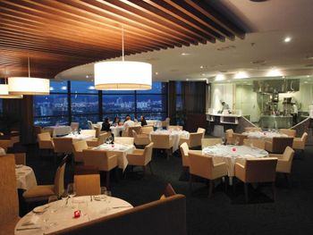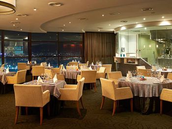 Расположение - в центре города и прямо в большом и относительно демократичном торговом центре. Вид из больших панорамных окон на город.