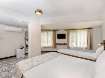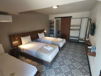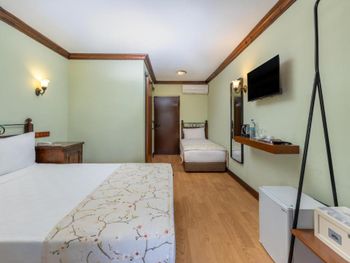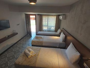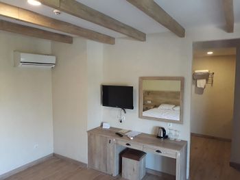 Территория отеля красивая, ухоженная, завтраки тоже прекрасные, горы, море, все чудесно, если бы не номер, номер нам дали, не тот, что на картинке и вроде по описанию есть и балкон и три кровати, но старый, точно надо делать ремонт, пахнет плесенью, ни одной тумбочки, ни шкафа, вода горячая шла только , если долго сливать, одна кровать стояла около двери , изо всех щелей дуло, сын проснулся с насморком, фото номера прилагаю, таких денег этот номер точно не стоит. нельзя селить в него троих взрослых, и двоих тоже, но поговорили с отелем, подключилась группа поддержки от букинга и переселили в комфорт за плату конечно. Номер комфорта тоже выложила, совсем другое дело, но возможно, за такие деньги, мы предпочли бы другой отель. Покушать можно только в отеле, рядом ничего нет, пару раз поужинали, не плохо, но дорого, мы брали автомобиль в аренду, поэтому ужинали и обедали не в отеле, где выбор намного больше и на любой кошелек. Поставила плохие оценки именно за первый номер, так как получается нас ввели в заблуждение, остальное все на уровне. Обратите внимание. что на фото оба номера, и ужасный и комфорт, к сожалению, запах нельзя передать по фото и старость тоже, как и периодическое отсутствие горячей воды.