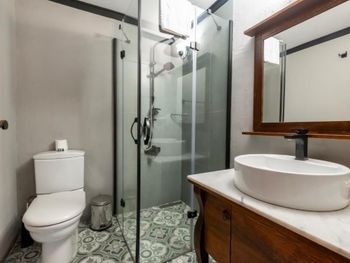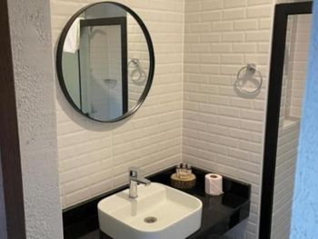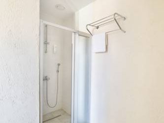 Множество косяков со стороны ремонта и работоспособности: сорванная с карниза штора, разваливающийся полотенцесушитель в душе, протекающий унитаз, тугая дверь душевой кабины.