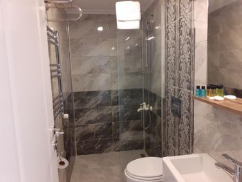 Особенно поразило аскетичное обустройство ванной комнаты и душа: свет тусклый, кафель серого мрачного цвета, у душа стекло только с одной стороны отделяющее душ от унитаза, ни дверки ни занавески, пока моешься все льется на пол и тумбочку раковины которая уже вся облезла и растрескалась, довершает картину громко гремящий вытяжной вентилятор.