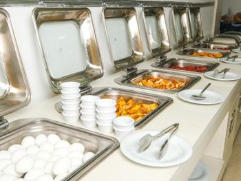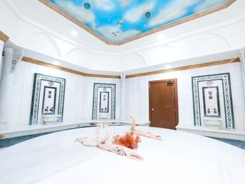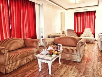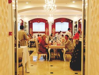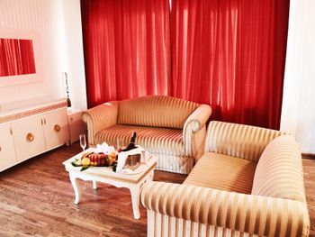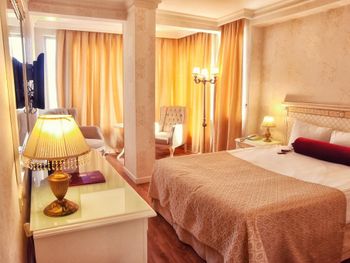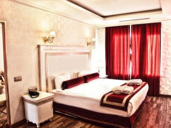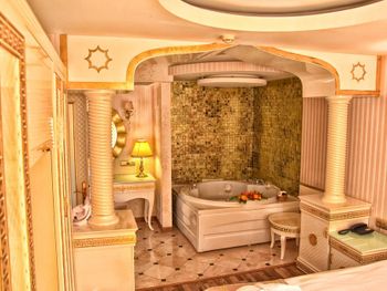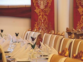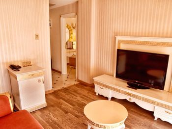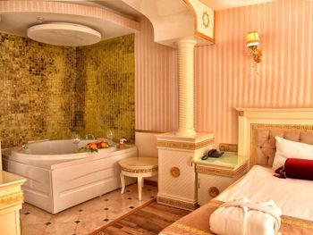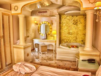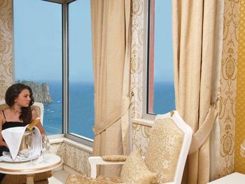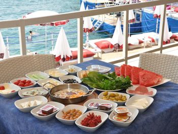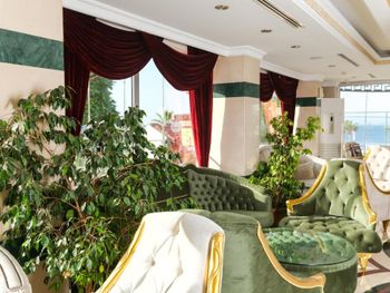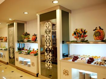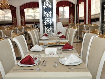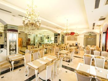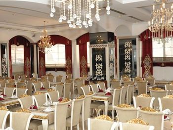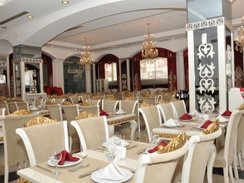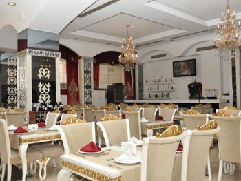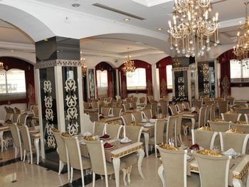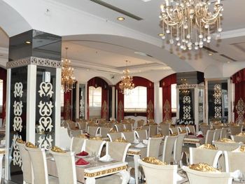 Ресторан с шикарными интерьерами декорирован роскошными люстрами. Гости могут заказать блюда турецкой или интернациональной кухни.