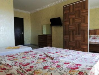 Расположение в частном секторе, до моря пешком идти около 30 мин. до центра около 1 часа. Рядом аэропорт, слышны самолеты. Равнодушное отношение персонала и хозяина к гостям. Интерес к гостям пропадает сразу после оплаты за проживание. В номере нет горячей воды. В санузле запах канализации. Постель застирана. Постель и полотенца стираются в отеле самостоятельно персоналом, там же сушится. Подушки с комками. Номер не убирался за время проживания не разу, даже мусор не выносили. Телевизор рябит. Описание на сайте не соответствует действительности. Балкон отсутствует, из туалетного набора на троих - один маленький кусочек мыла, нет тапочек. В отеле кафе, цены как в ресторане в центре города, а порции вдвое меньше и выбор только из трех блюд. Меню нет. Вечером попросили бокалы, дали с условием возврата рано утром. В номере нет чайника, чайного набора, фена.