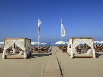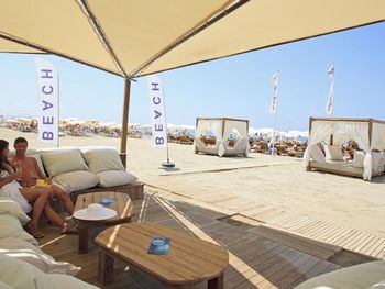 Пляж песчаный, но между шезлонгами и морем есть полоса гальки, где довольно много мусора