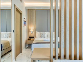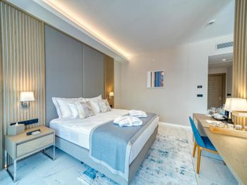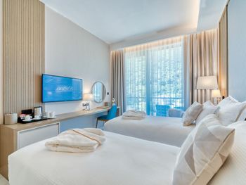 - муравьи которые пробирались в номер при удобном случае, которых персонал смывал моющим средством; - бронировали номер с 1 двухспальной кроватью, а получили две односпальные кровати сдвинутые вместе, 3 раза просили заменить, все так и осталось; - шкаф при заезде блестел на солнце грязными разводами по всей площади двери, предположительно от шампанского или от спрея солнцезащитного от предыдущих жителей; - батарея для просушки купальников самопроизвольно выключалась; - добились замены номера, который по итогу оказался меньше предыдущего и опять же с двумя сдвинутыми односпальными кроватями; - на балконе располагался осиный улей из-за чего оставлять балконную дверь открытой не хотелось; - во включённый ужин из напитков была доступна только вода со льдом, остальные напитки за отдельную плату.