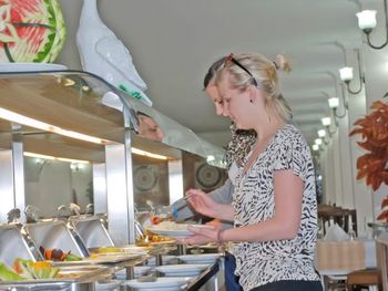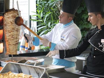 На приемах пищи часто не хватает мест людям и они стоя ждут когда освободятся столы, так что приходите пораньше