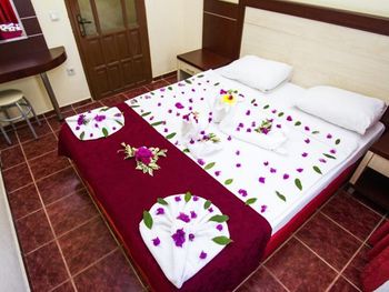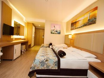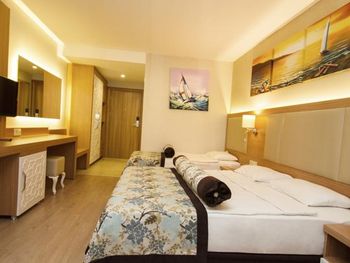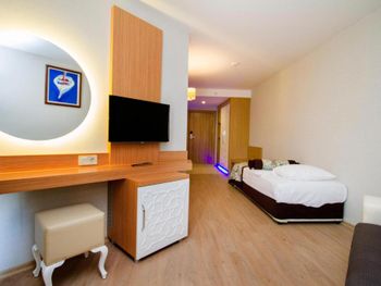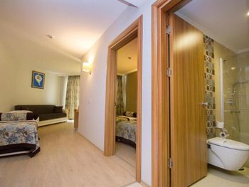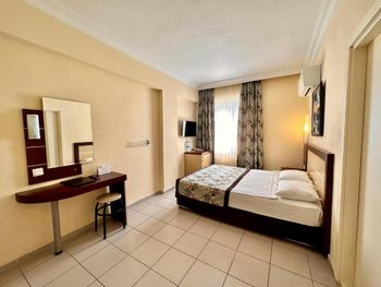 С едой не большие проблемы,нет разнообразия,молочная каша только рисовая,либо хлопья.С розетками тоже какое-то проблемы,телефон зарядить возможно только если его выключить,если включённым заряжать,то это займёт больше 3-4 часов.Были проблемы с номером,при заселении обнаружили каких-то букашек,которые сразу начали ползать по телу и одежде,дать другой номер сначала отказались,сказали проведут дезинфекцию,но не помогло,потом был разговор о другом номере,не хотели менять,пока мы не позвонили знакомому(турку)и уже после этого разговора,на следующий день дали другой номер!Ещё очень не понравилось что при заселении с ребенком(5 лет) предоставили номер с двумя односпальными кроватями,это очень не удобно! Мы бронировали 2 номера,в одном из номеров были очень плохие подушки,похоже их постирали и они взбились в один комок!