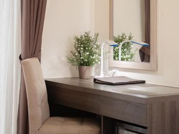 Есть рабочий стол и холодильник для напитков, также сейф, фен, халатики, тапочки, даже ложка для обуви.