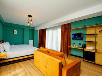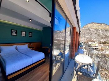 Нам повысили категорию номера бесплатно, дали люкс на 4 этаже с панорамными окнами и замечательным балконом,с которого открывается вид на горы,помогли занести вещи в номер,приветливый управляющий который располагает к себе,очень уютный отэль,парковка хоть и у дороги но все равно удобно так как находится рядом со входом.