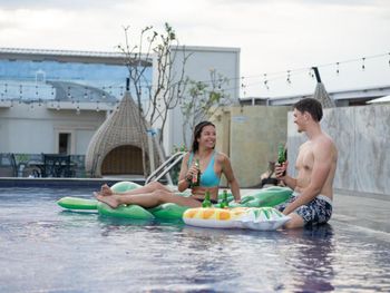 До моря минут 15, но невелика потеря, так как плавать среди пакетов и пластиковых бутылок/стаканов не доставляет особого удовольствия. Пляж стоит посещать только ради заката или учиться серфить. Расположение в целом неплохое, в тихом переулке без караоке и шумных баров, можно спокойно лечь хоть в 9 вечера. Бассейн на крыше небольшой, но с приятным видом. 2 бутылки водички ежедневно комплиментом от отеля. На время ожидания заселения разрешают пользоваться бассейном. Интернет ок.