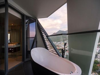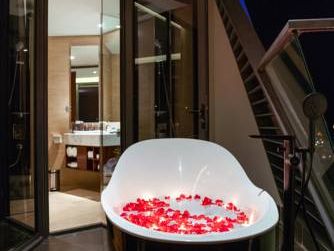 +Our room was very comfortable. We had two balconies with sea and Mountain View. There was a bath located on one of the balconies. +Upon arrival Hotel decorated our room with flowers leaves and presented a cake for our honeymoon vacation. +location of the hotel in more quiet Nothern part of the city was an advantage for us. + free shuttle bus goes every hour to the Nothern beach and back. The hotel has its own piece of the beach with free sun beds and umbrellas . Towels are available on the beach after you show the beach card from the hotel. + Hotel has a nice pool on the 7th floor with water bar and beautiful sea view +Наш номер был очень комфортный с 2 балконами. На одном из балконов была ванна. +К нашему приезду отель украсил наш номер лепестками роз и подарил нам праздничный торт к свадебному путешествию. + расположение отеля в северной спокойной части города было для нас преимуществом. + бесплатный электрокар каждый час доставляет постояльцев отеля на Северный пляж. У отеля там есть маленький кусочек с бесплатными шезлонгами и зонтами. Полотенца выдают уже на пляже по карточке гостя отеля. + в отеле есть хороший бассейн на 7 этаже с баром на воде и красивым видом на море и город