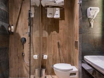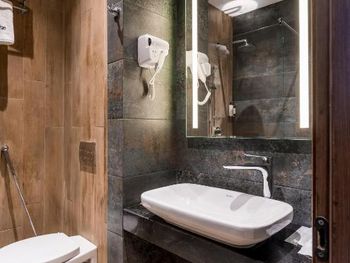 + Хороше местоположение. Но улица некрасивая, темная и страшная. + Номера достаточно уютные, среднего размера для данного сегмента. + В номере есть все необходимое: чайник, вода, сейф, столик для чемодана, фен, и т. д. Есть гигиенический душ в туалете.