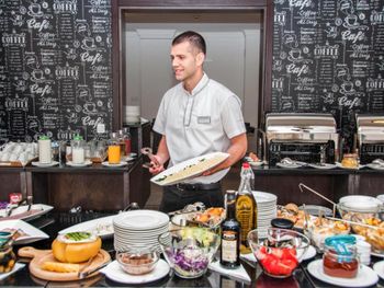 Хорошая ежедневная уборка. Приветливый персонал, в том числе русскоговорящий. Вечером можно приятно прогуляться по набережной до центра городка, где нечего делать. Есть милый музей Булгакова (!). Спойлер - Булгаков "притянут за уши", конечно он и не знал про существование этого городишки. Есть пара супермаркетов в округе, но они очень "бедные", вкусняшек там не найти. Есть малюсенький бассейн, глубиной по пояс, с чистой водой. Завтраки хорошие, но без горячих блюд и при всей насыщенности довольно однообразные.