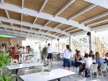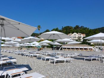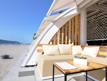 Пляж в 15 минутах ходьбы по раскаленной набережной. Да и тот либо бетонный пирс, либо строительный щебень (слегка утрирую, но выглядит как щебенка со стройки). Есть красивый и большой пляж другого отеля рядом, но он стоит 160 евро с человека в сутки. Рядом очень хороший ресторан, но весьма дорогой (15- евро блюдо, рыба 80 Евро = кг). Хотя кому как. Остальные рестораны поблизости просто отстой, готовят из полуфабрикатов. Короче - вкусно поесть не получится. Отель стоит на дороге, по которой круглосуточно гоняют машины и мотоциклы. Если ваша комната на сторону отеля - открыть окно не получится. Кондиционеры есть, но ночью не включишь, очень шумные.