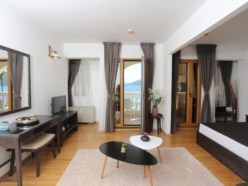 Очень приветливый персонал, каждую минуту готовый помочь с любым вопросом. При заезде нас ждал приятный сюрприз - welcome бутылка красного вина и вода. Просторный, очень комфортный номер с видом на море. Вид с балкона - захватывает дух! Однажды мы встретили рассвет прямо на балкончике, эти картинки останутся в памяти на всю жизнь! В номере - все необходимое для комфортного проживания, включая халаты, тапочки, косметические принадлежности, чайник, чай и кофе. Очень удобная кровать, а подушка одна из лучших, на которых нам только доводилось спать. Комфортный сон обеспечен! Отелю принадлежит пляж (плита) в 7 минутах ходьбы. Рядом также несколько других городских пляжей (галька, песок). До старого города - 30 минут прогулки по набережной, по дороге много ресторанчиков, где можно поужинать (в отеле на ужин ресторан не работает). Завтраки!!! Это нечто потрясающее. Никогда в своих путешествиях мы не встречали настолько большого разнообразия и деликатесов. Все очень вкусно! Описывать нет смысла, это надо пробовать ;)