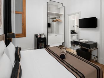Я бронировала улучшенные номера. Площадь номера была указана 27 кв.м. При заезде мы получили два номера на 5 этаже. Один из которых был очень маленький. Зато с балконом - пояснили нам сотрудники отеля. Кому в декабре нужен балкон? И потом, если бы мы хотели номер с балконом, то его бы бронировали. В отеле всего два лифта, с одним из которых постоянно были проблемы. Одна большая кровать - это сдвинутые две кровати, накрытые одной простыней с провалом посередине. Полотенца застиранные до серости. С махрящимися краями и огромными пятнами. Прикроватные тумбочки были липкие, я попросила их помыть, но их просто протерли и липкие пятна так и остались. По углам душевой кабины внутри и снаружи вековая пыль. Кондиционера индивидуального нет, а общий работает плохо. Слышимость улицы очень сильная. Меня не спасли даже беруши. Верхнюю одежду повесить некуда. Крючков нет. В номере небольшой шкафчик открытого вида (как на фото) и все. 5 встроенных вешалок в шкафу с низкой штангой. В ванной два крючка, так что либо полотенца висят, либо халаты. Ни кресла, ни стула. Только банкетка. Завтрак в цокольном помещении, там же где и ресторан. Кофе - растворимый. Чай из бачка. Из горячих блюд - какая-то мешанина типа омлета и сосиски.