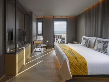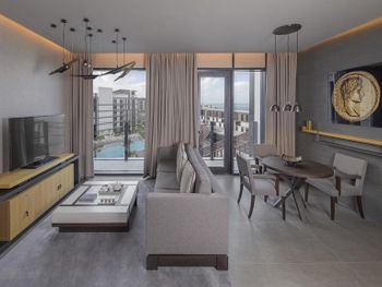 Локация топ. Понравились новые шезлонги и желто-белые зонты на пляже. Красивый интерьер лобби и номеров, где используются натуральные материалы: на полу мрамор, в отделках стен и мебели шпон натурального дерева.
