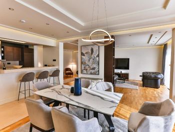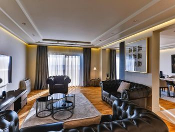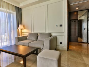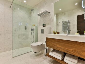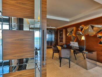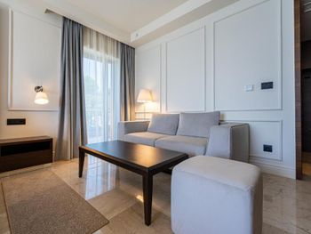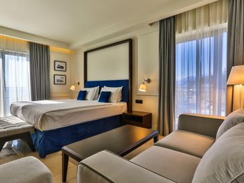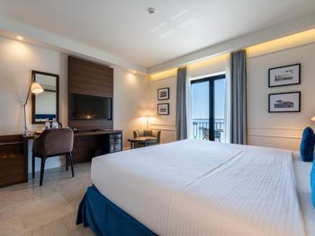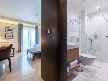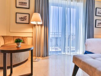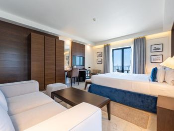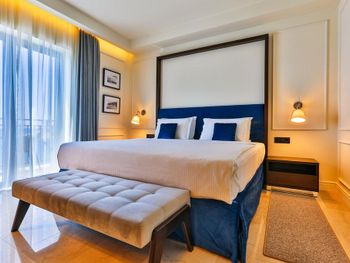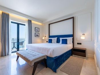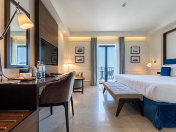 Проживали в самой высокой категории номера - ощущение привокзального отеля. Затхлый запах приветствует ещё до входа в номер, гостиная- без единого элемента декора, какой-то кусок дорожки вместо ковра. В спальне пружинный матрас, воду перед сном не приносят, в мини баре 2 маленькие бутылочки , гоняли сына в бар внизу за водой. Пятна на плитке в санузлах, из 5* только косметика для душа Etro. Заход в воду - валуны, если штормит - можно разбить не только ноги ( это не вина отеля, но расчистить часть для захода могли бы) Пляжные полотенца не выполосканные, влажные и с запахом химии. Завтрак и ужин - отдельный опыт((( На завтрак прекрасный персонал ознакамливает с набором шведского стола, сервирует приборы. В ассортименте фрукты, сыр, горячее и холодное мясное, блюда из яиц - но!!! Все, что холодное - не прикрыто, просто кормушка для мух. Ужин - при прекрасном обслуживании - блюда, как из 90-х годов по стоимости звездного ресторана. Не рекомендую для тех, кто привык к качественным 5*